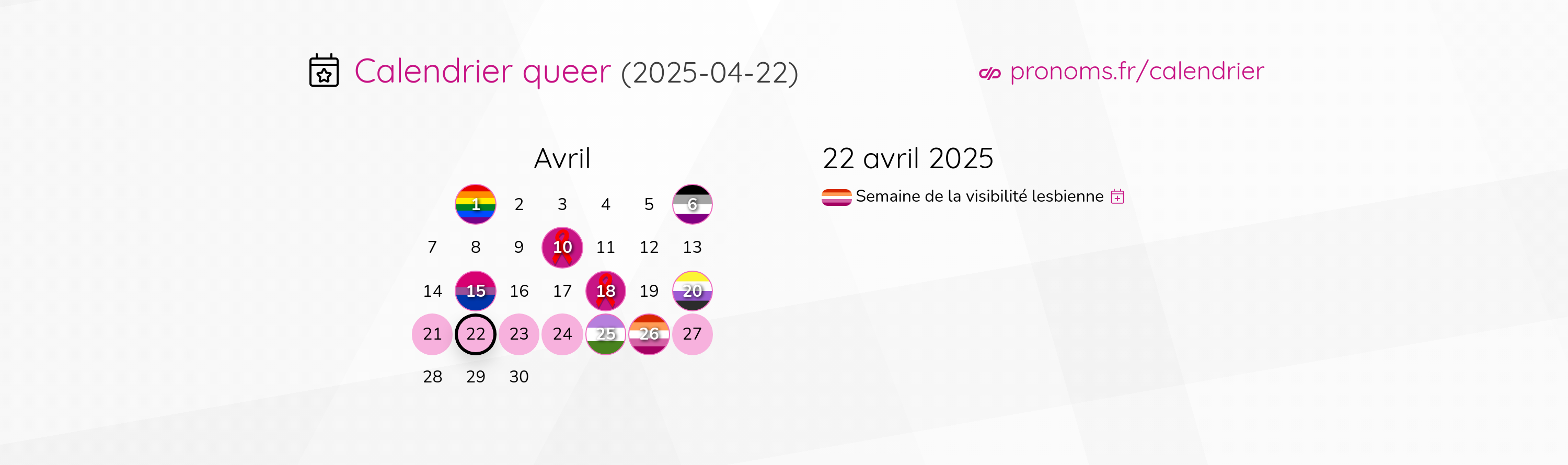 • A rectangular flag with five equal-width horizontal stripes: orangey red, orange, white, light magenta, dark magenta A rectangular flag with five equal-width horizontal stripes: orangey red, orange, white, light magenta, dark magenta Texte alternatif : A rectangular flag with five equal-width horizontal stripes: orangey red, orange, white, light magenta, dark magenta Semaine de la visibilité lesbienne